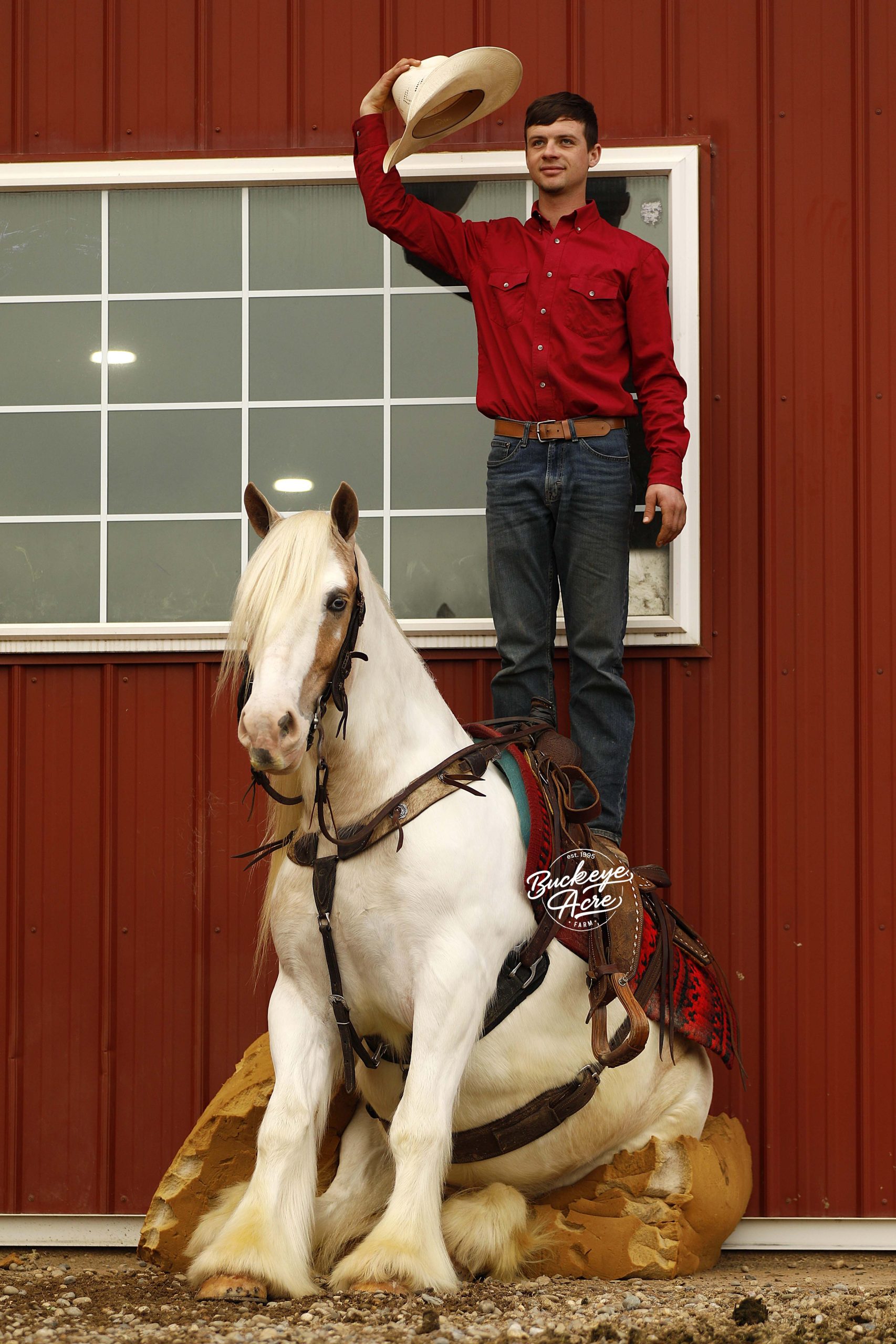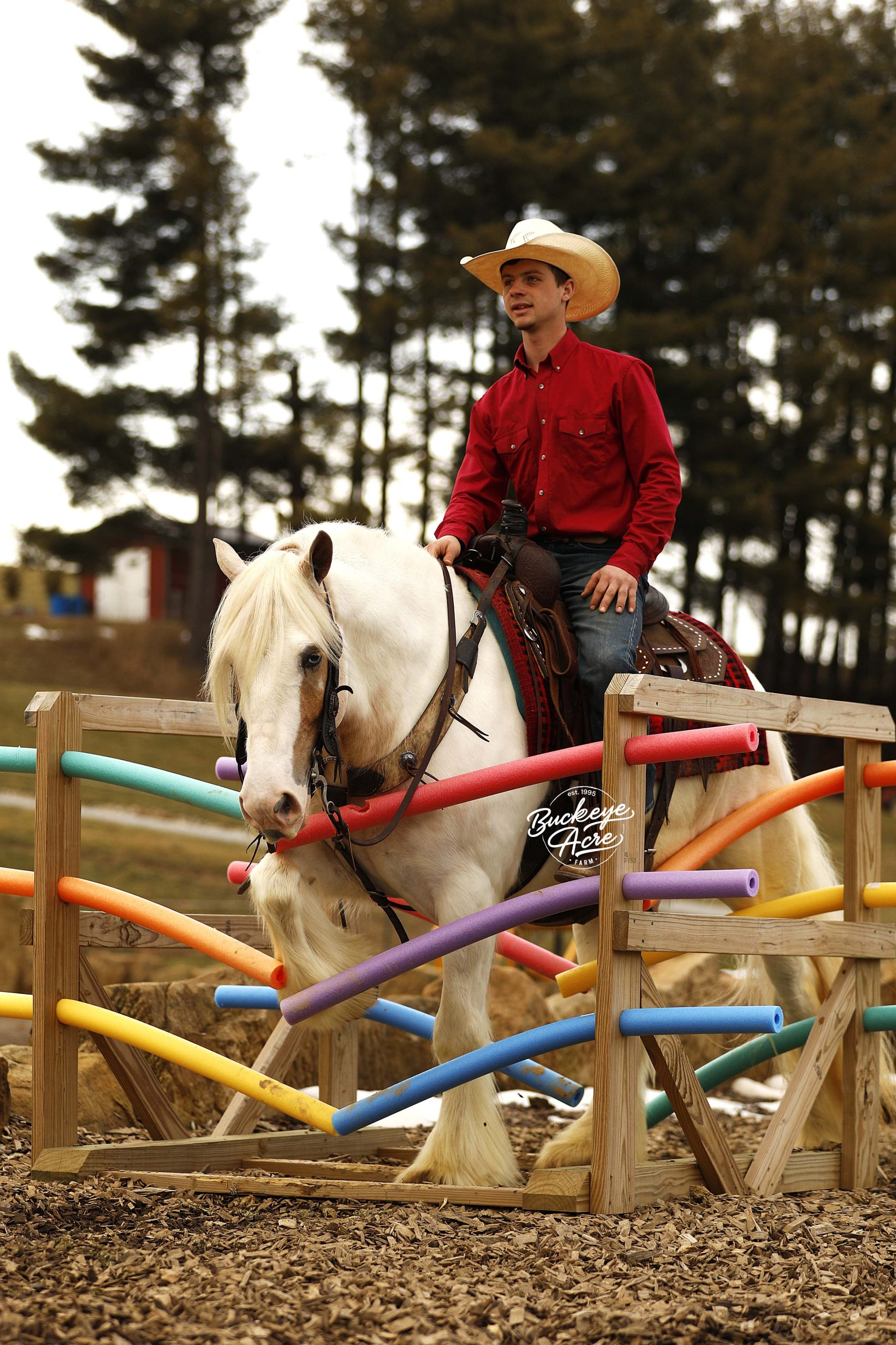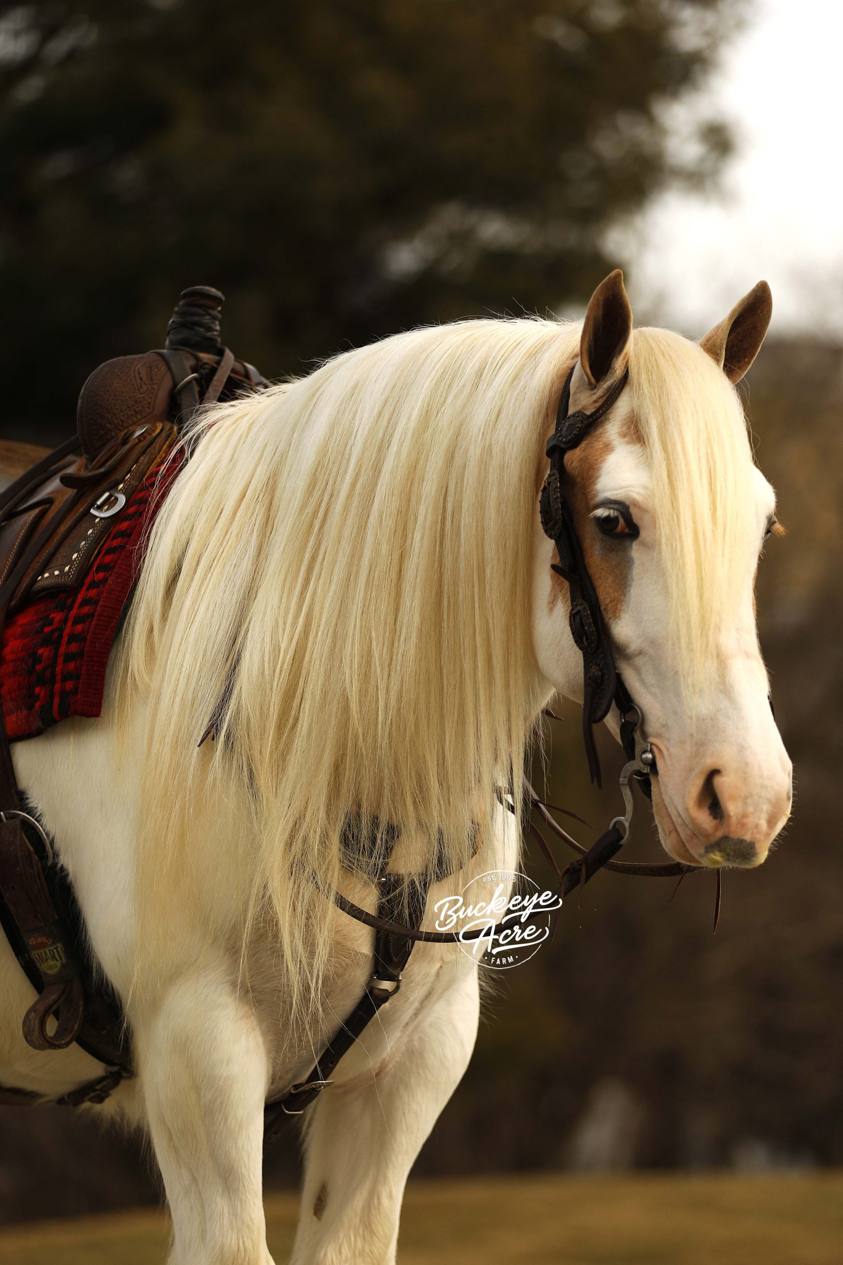 Bingo is a 2018 model standing 14.3 hands and registered with the Gypsy Horse Association. With his rich Palomino Tobiano color and one striking blue eye, he naturally grabs attention wherever he goes — but it is his ability and disposition that truly set him apart. In the arena, he rides Western, English, and bareback with the same steady, willing attitude. He knows his leads, side passes with ease, and carries smooth, comfortable gaits that make him enjoyable for long rides or relaxed schooling sessions. He stays soft, responsive, and aims to please every time you swing a leg over. Bingo also drives in the carriage and does so confidently, showing his versatility and solid foundation. He has been exposed to plenty and handles it all with a level head — traffic on state roads, whips, jugs, tarps, flags — he takes it all in stride. He has even trained to sit down, which never fails to impress and shows just how willing and broke he is. Outside the arena, he has logged many trail miles. He crosses water without hesitation, navigates different terrain with confidence, and is comfortable checking cows. He genuinely enjoys getting out and exploring new places, making him a fun and dependable partner for adventures. His temperament is one of his best qualities. He has a kind, steady mind and a true want-to-please attitude. In the barn, he is respectful and easy to handle. In the pasture, he gets along well with others or is perfectly content turned out alone. Bingo is up to date on his vaccinations, deworming, and shoeing, making him ready to step right into his next home. If you are looking for a flashy gelding with real-world experience, versatility, and a great personality to match his good looks, Bingo offers the complete package — a horse that is just as enjoyable to ride as he is to own. Please feel free to reach out to Duane @ 330-231-2324 for more information.