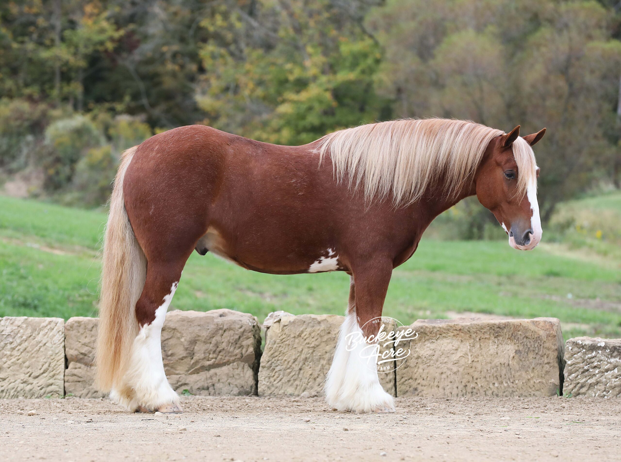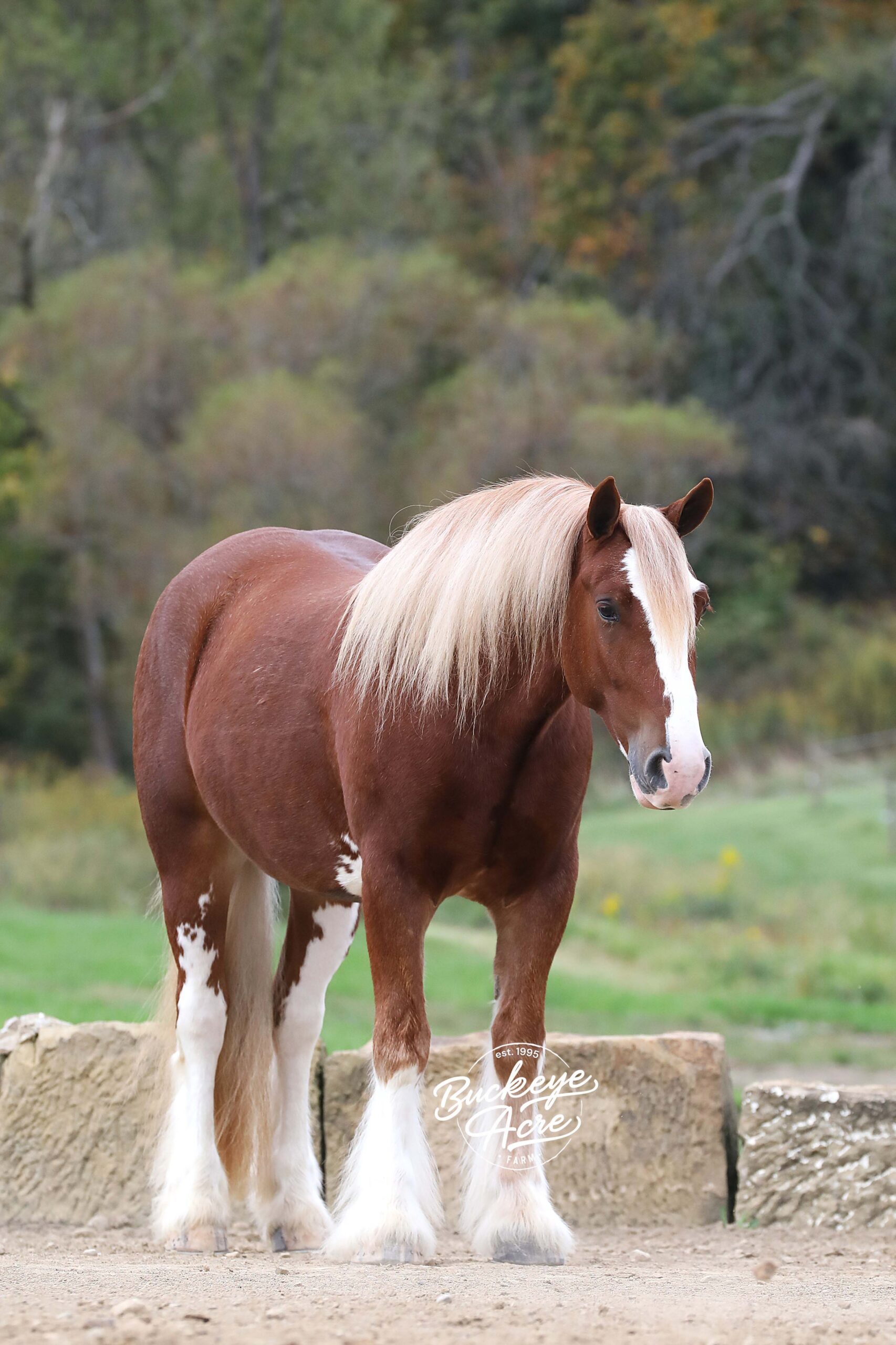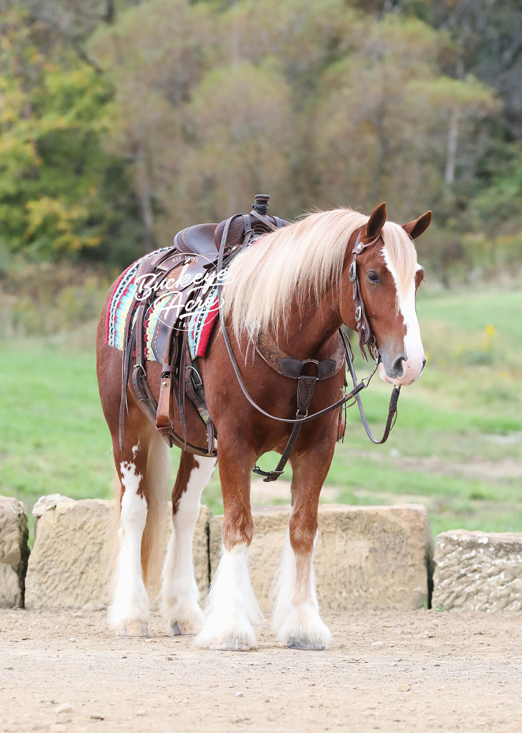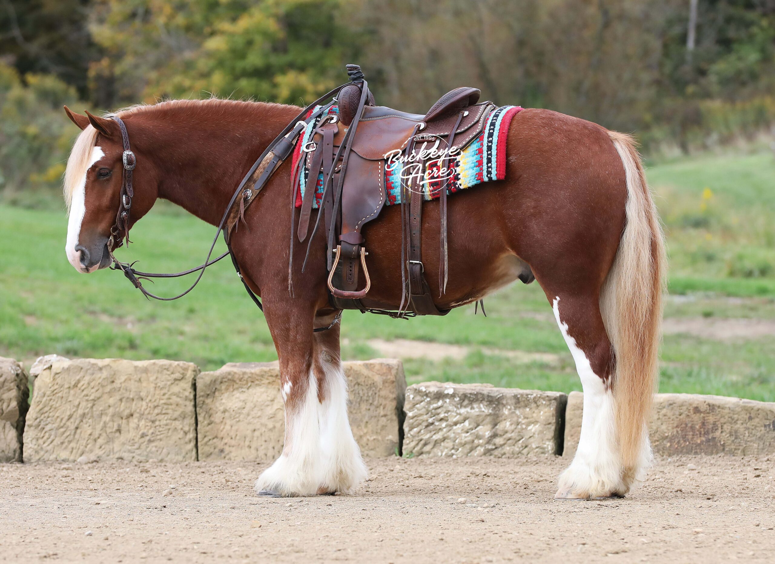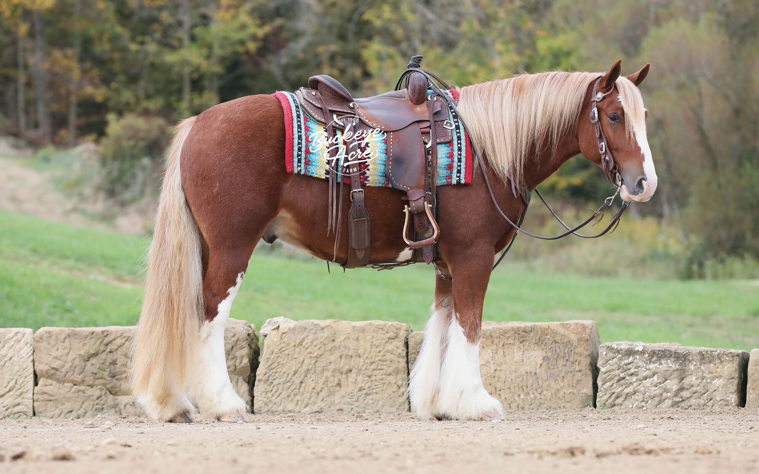Occasionally, a horse comes along that truly has it all — looks, brains, training, and heart. We are beyond privileged to offer Chrome, a 2021 model registered Gypsy Vanner gelding standing 14.3 hands. With his gleaming sorrel coat, four perfectly matched white socks, and bold white blaze, he is as striking as he is dependable. Chrome is not just another pretty face — he has been there, done that, and keeps impressing us. He has covered miles of trails with confidence: splashing through creeks and rivers climbing, and descending hills, stepping over downed logs, and traveling along state roads where he has proven himself completely traffic safe. Whether you are riding under arena lights or out in the open, Chrome is steady, smooth, and fun. He is as versatile as they come — beginner, kid, or advanced rider safe. Ride him once a week or once a month and he will be the same horse every time you pull him out. Even if you simply enjoy seeing him out in the pasture, his friendly, puppy-dog personality will make you smile every time you lay eyes on him. In the arena he knows his leads, carries a soft one-hand neck rein, side passes easily to the mounting block, and is responsive yet quiet. He has trained to sit down, stand proudly on a pedestal, and is well-desensitized to tarps, gunfire, jugs, whips, and anything else you might ask him to face. Chrome has that bright, kind eye and true puppy-dog nature. He is always curious, always eager to please, and always meeting you at the gate. He is polite in the barn, calm in the wash bay, stands well for the farrier, and settles easily whether turned out alone or in a herd. He even drives as beautifully as he rides, making him a true all-around family horse. With his looks, training, and mind, Chrome will get you noticed anywhere you go. We even think he has the talent and temperament to excel in fox hunting or other new adventures. Horses of this quality and versatility do not come around often, and we cannot say enough good things about him. If you have been searching for a once-in-a-lifetime partner, look no further. Call or text Duane at 330-231-2324 to learn more or schedule a time to meet Chrome in person — you’ll see why we’re so excited about him!