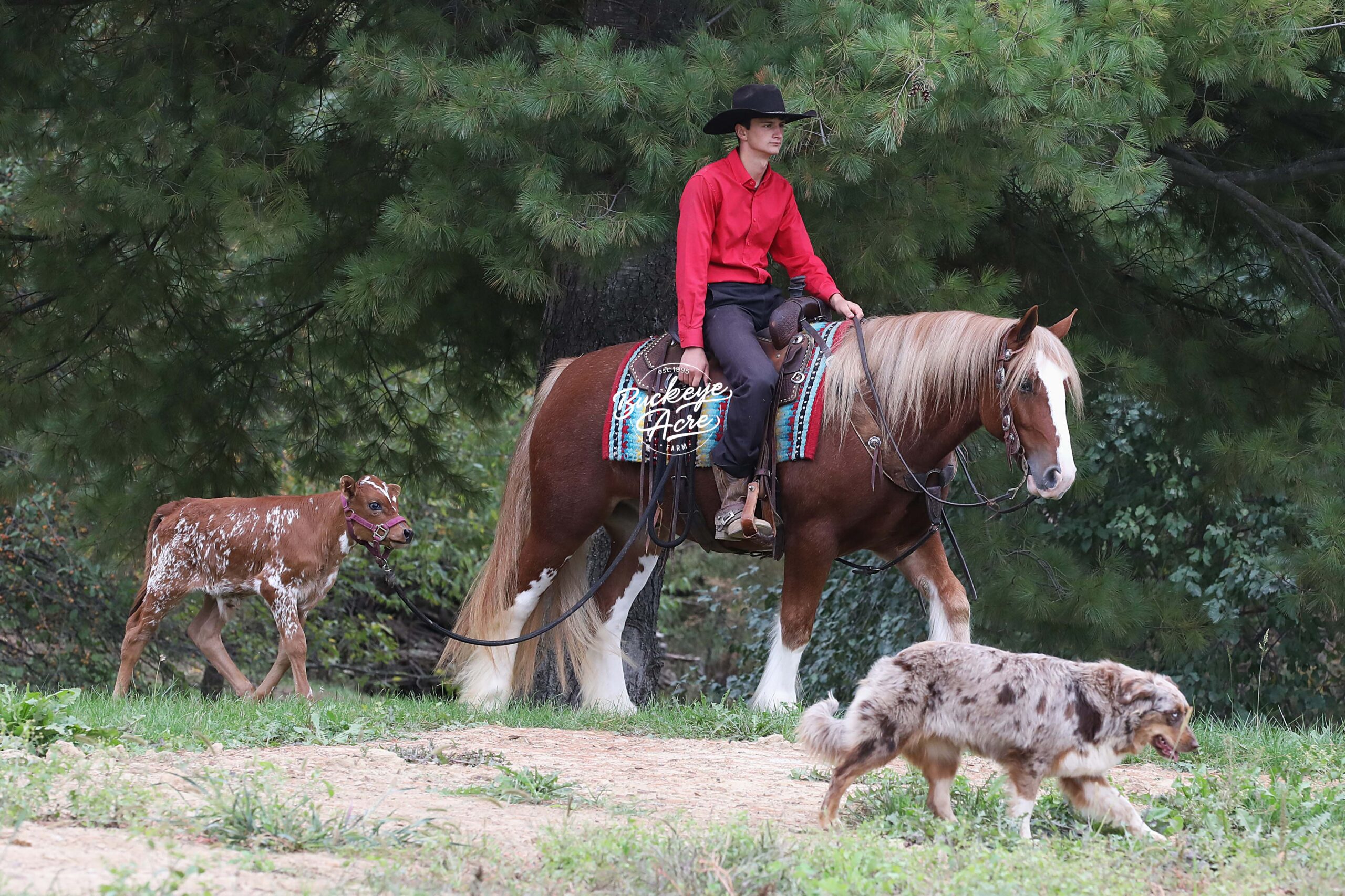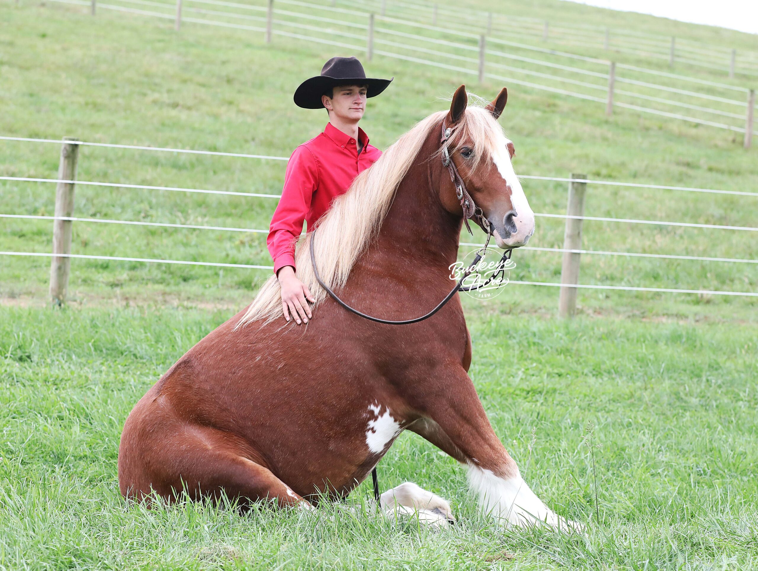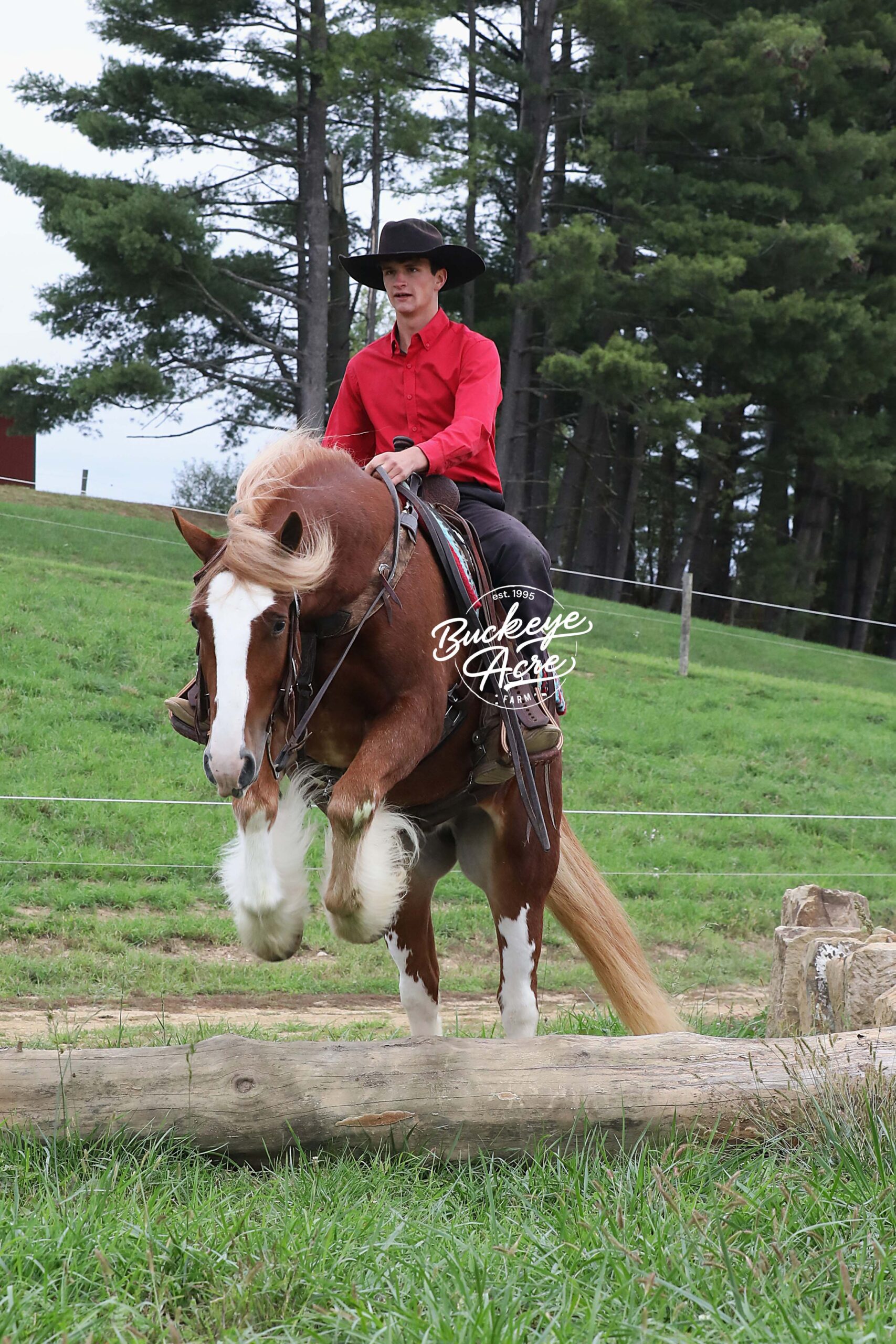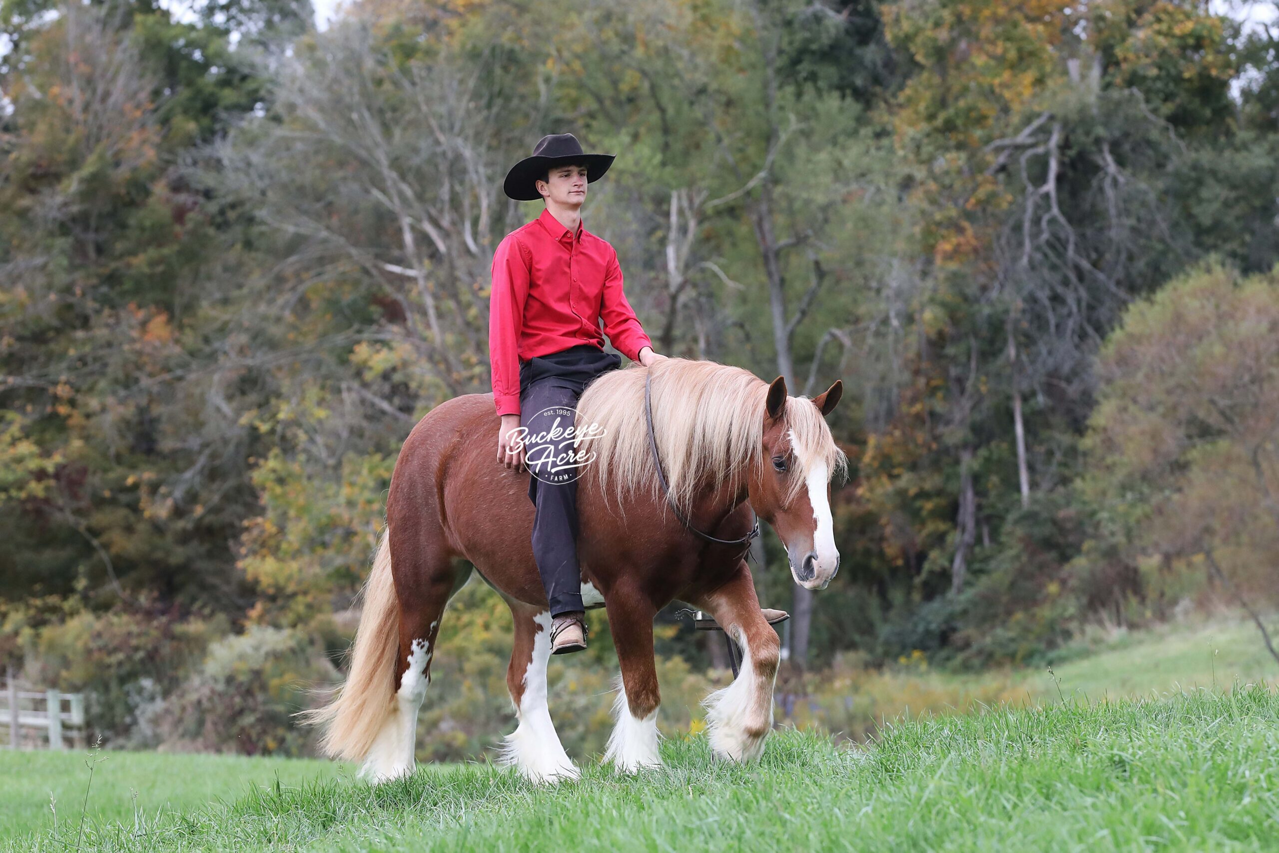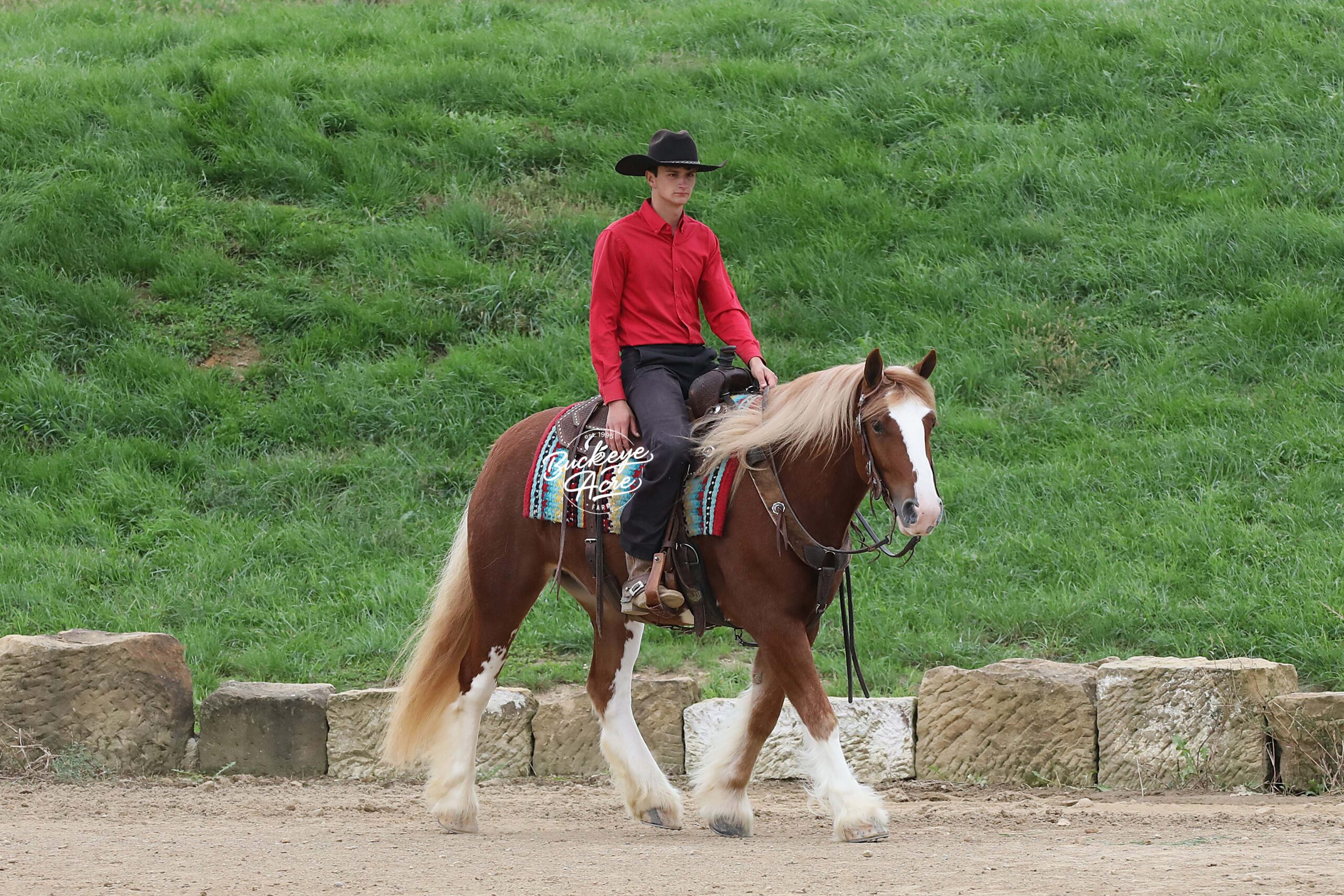 Occasionally, a horse comes along that truly has it all — looks, brains, training, and heart. We are beyond privileged to offer Chrome, a 2021 model registered Gypsy Vanner gelding standing 14.3 hands. With his gleaming sorrel coat, four perfectly matched white socks, and bold white blaze, he is as striking as he is dependable. Chrome is not just another pretty face — he has been there, done that, and keeps impressing us. He has covered miles of trails with confidence: splashing through creeks and rivers climbing, and descending hills, stepping over downed logs, and traveling along state roads where he has proven himself completely traffic safe. Whether you are riding under arena lights or out in the open, Chrome is steady, smooth, and fun. He is as versatile as they come — beginner, kid, or advanced rider safe. Ride him once a week or once a month and he will be the same horse every time you pull him out. Even if you simply enjoy seeing him out in the pasture, his friendly, puppy-dog personality will make you smile every time you lay eyes on him. In the arena he knows his leads, carries a soft one-hand neck rein, side passes easily to the mounting block, and is responsive yet quiet. He has trained to sit down, stand proudly on a pedestal, and is well-desensitized to tarps, gunfire, jugs, whips, and anything else you might ask him to face. Chrome has that bright, kind eye and true puppy-dog nature. He is always curious, always eager to please, and always meeting you at the gate. He is polite in the barn, calm in the wash bay, stands well for the farrier, and settles easily whether turned out alone or in a herd. He even drives as beautifully as he rides, making him a true all-around family horse. With his looks, training, and mind, Chrome will get you noticed anywhere you go. We even think he has the talent and temperament to excel in fox hunting or other new adventures. Horses of this quality and versatility do not come around often, and we cannot say enough good things about him. If you have been searching for a once-in-a-lifetime partner, look no further. Call or text Duane at 330-231-2324 to learn more or schedule a time to meet Chrome in person — you’ll see why we’re so excited about him!