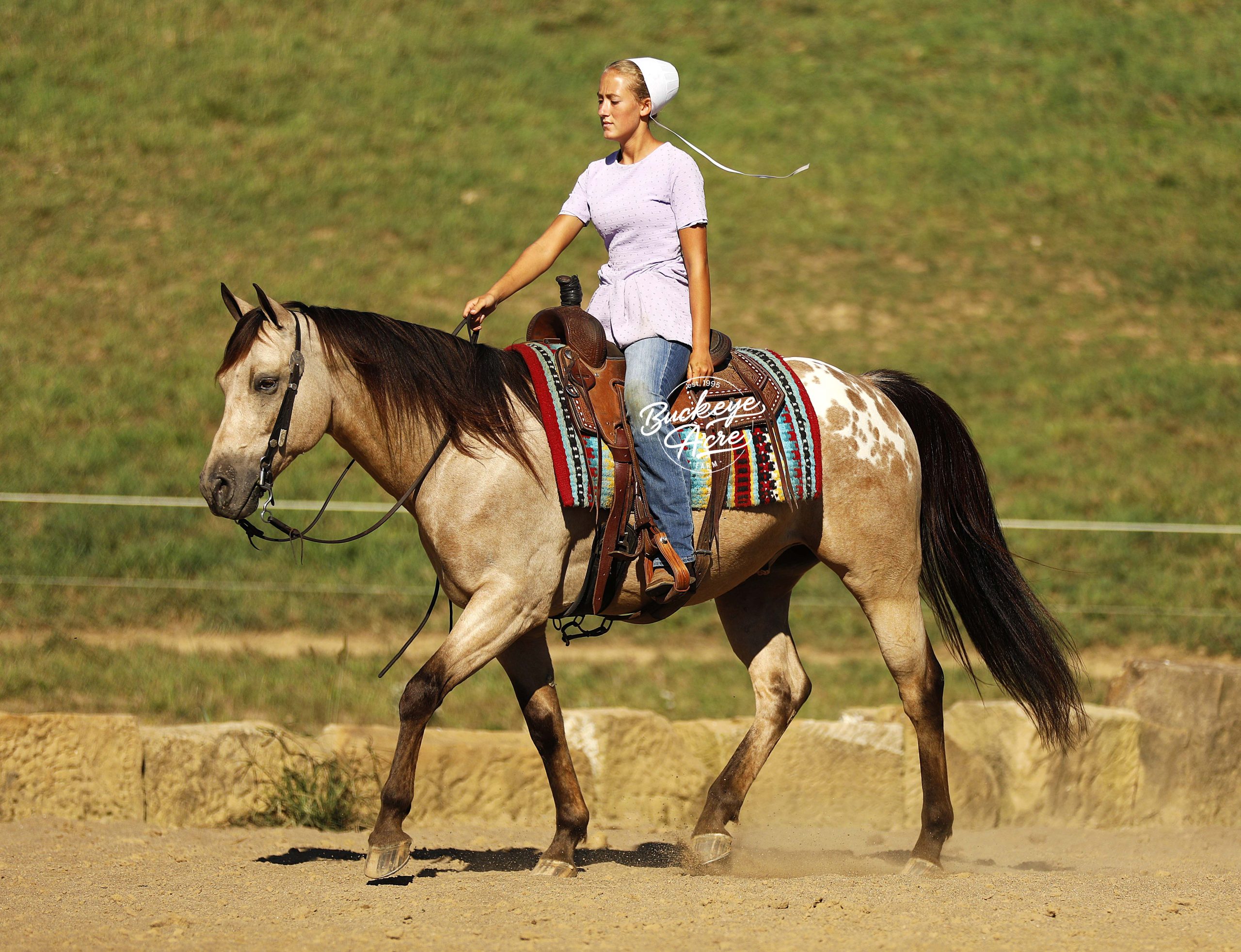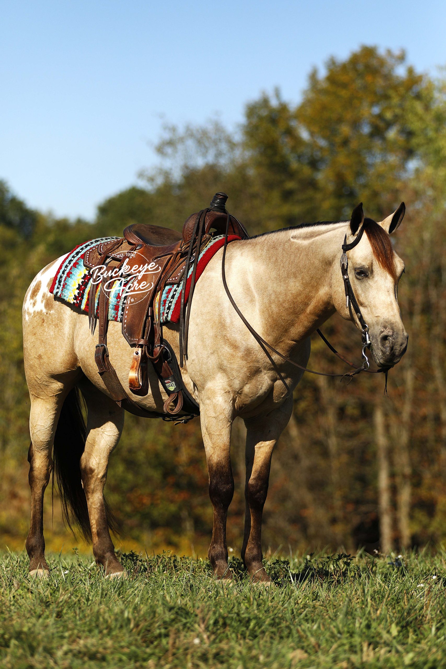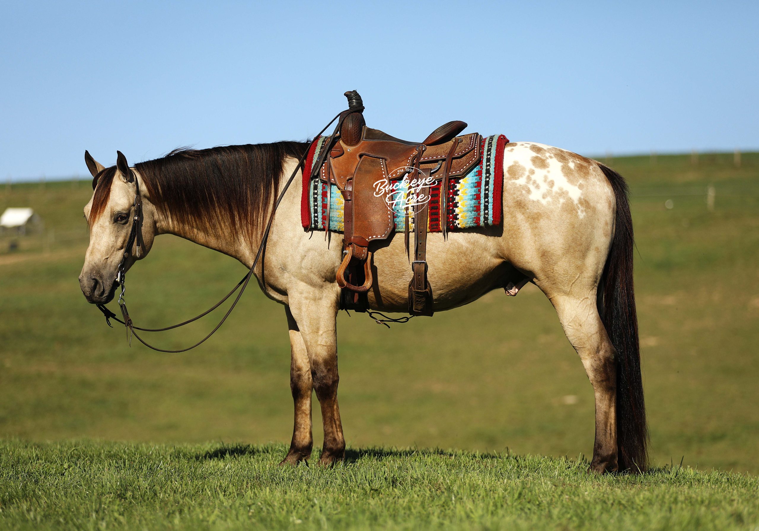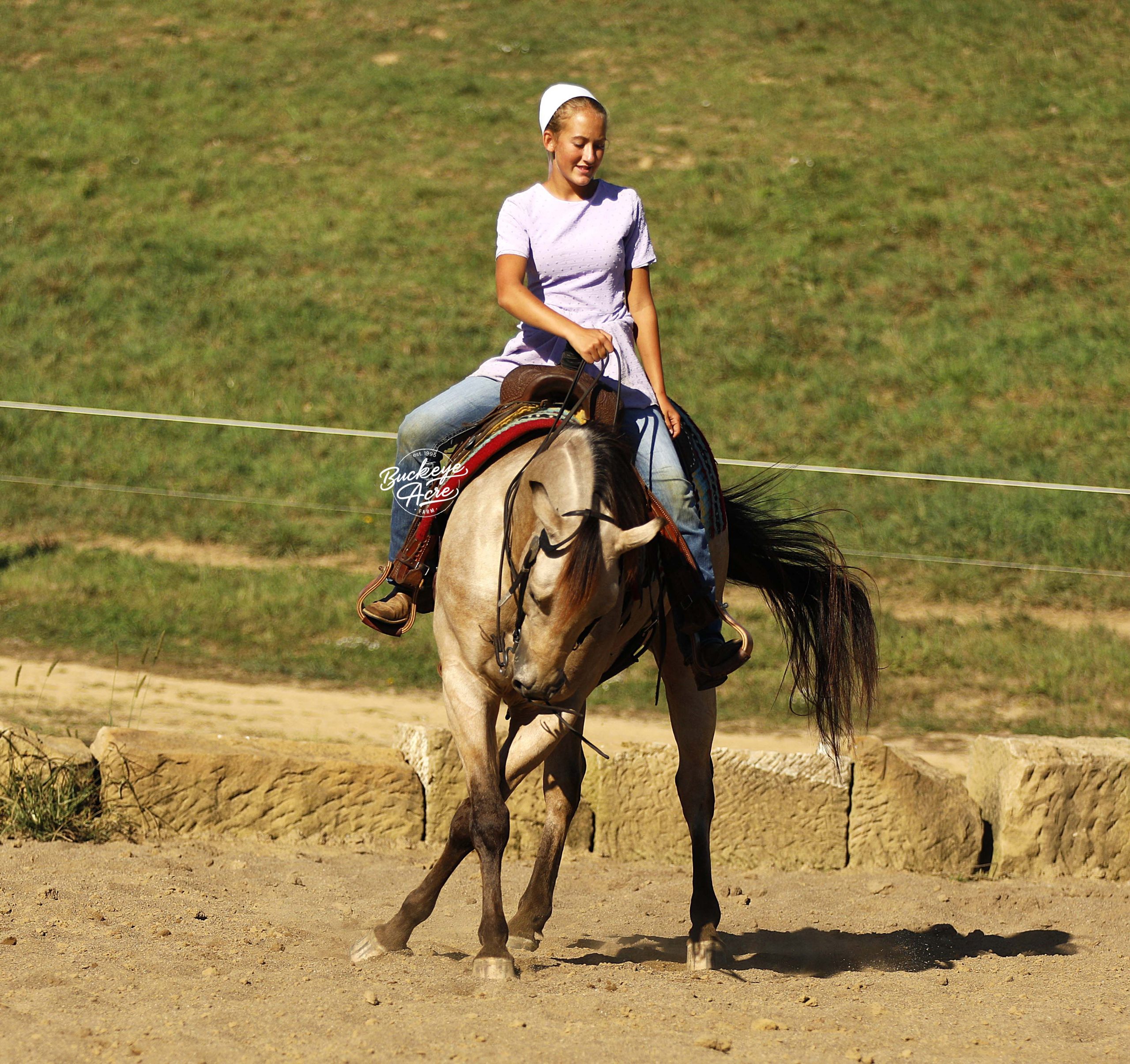 Wow, wow — where can you find a horse like Loyal? This handsome 2019 Quarter Horse cross stands 15.1 hands tall and has one of the most unique color combinations you will ever see. He is a golden buckskin with soft Appaloosa dapples across his hips, four jet-black socks, and a long black mane and tail that shimmer in the sun. His color alone will make you stop and stare, but it is his gentle personality that truly sets him apart. Loyal has been almost everywhere you can think of. He has been down long country trails, across open fields, through creeks and rivers, and up and down steep hills. He has crossed logs, bridges, and ditches without hesitation. He has also been down busy state roads and through town, taking cars, trucks, and traffic noise all in stride. Loyal has been used to check cows and fence lines, and he enjoys having a job to do. He is steady-minded and sure-footed, never in a hurry, but always willing. This gelding has been desensitized to about everything, tarps, jugs, gunfire, whips—and he has even carried the flag. He is confident wherever you take him, whether it is a quiet solo trail ride or a busy group outing. Loyal has also spent plenty of time in both the indoor and outdoor arenas. He knows his leads, moves off leg pressure, and will side-pass right up to the mounting block for you with just a lift of your arm. He rides soft in the bridle, has nice transitions, and listens closely to his rider. Loyal’s movement is as smooth as it gets. His walk is relaxed, his jog is steady and comfortable, and his extended trot covers ground beautifully. His lope is easy to sit in and rhythmic enough to ride all day long. Whether you are a weekend trail rider or someone looking for a versatile all-around partner, Loyal fits the bill. He is the same dependable horse every time you saddle him up. Ride him once a week or once a month, he stays consistent, kind, and ready to go. Loyal has the type of disposition that makes him suitable for anyone, from kids learning to ride to senior riders who want something safe and enjoyable. He is patient, forgiving, and always tries to please his rider. Loyal is up to date on all his vaccinations, shoeing, and deworming, and he is sound and healthy in every way. He is the kind of horse that makes you proud to own him—not just because of his striking looks, but because of his willing heart and steady nature. From the arena to the trails, from parades to pastures, Loyal is a horse you can count on to make every ride a good one. Every time you see him standing there with that golden coat and kind eyes, you will find yourself smiling. Loyal is not just another pretty face, he is a trustworthy, honest partner ready to take care of his next rider, wherever the trail leads. If this sounds like the horse that you have been looking for, please feel free to reach out to Duane @ 330-231-2324 for more information or to stop by and see him in person.
