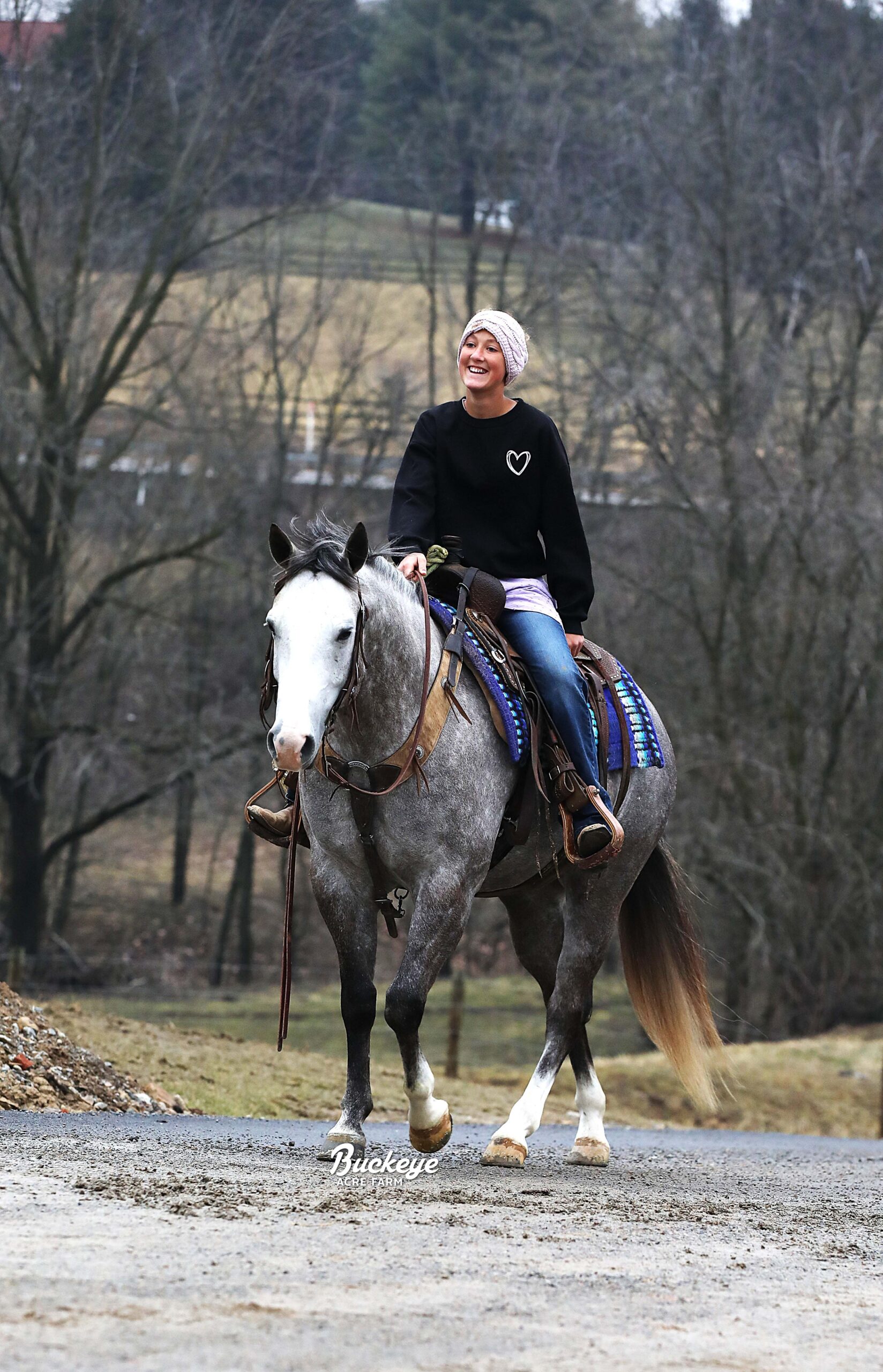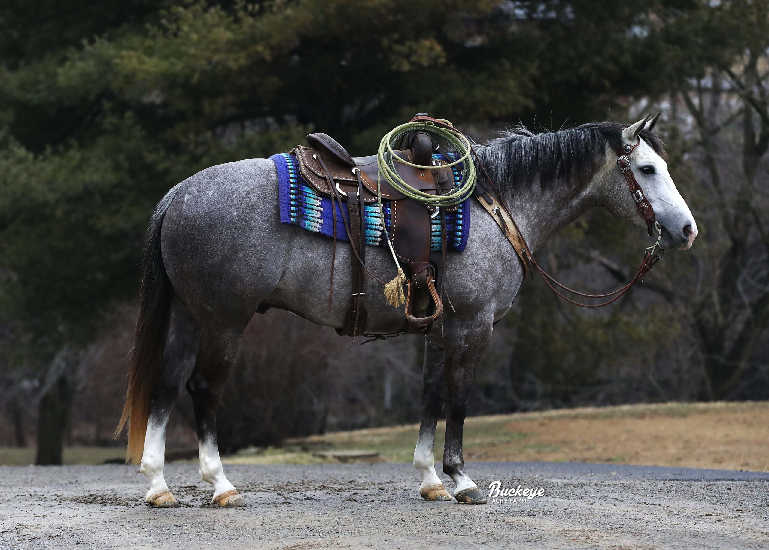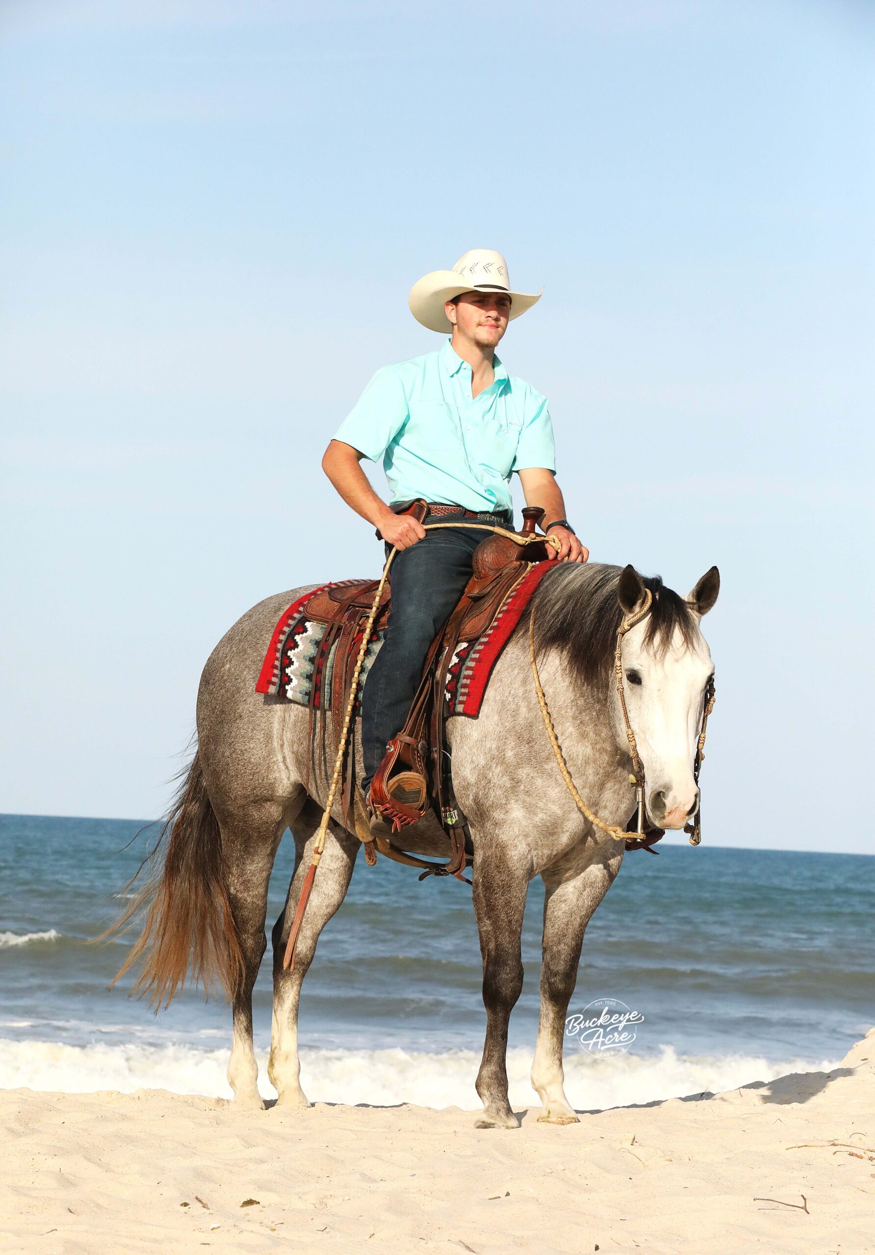 Meet Dexter, a 2020 AQHA dapple grey gelding that stands out in both looks and ability. At 14.2 hands, Dexter is built like a tank with a solid, muscular frame and four white feet that give him a striking appearance, along with a unique touch of white on his nose. His eye-catching looks will certainly turn heads wherever he goes, but it is his versatility and hardworking nature that truly make him special. Dexter has proven himself in many areas, he has been ridden extensively in the arena, on trails, and even out on the ranch gathering cattle. With his sturdy build and reliable work ethic, Dexter is more than capable of handling a day of hard work, whether that is riding out to move cattle or tackling any job around the ranch. His strong, steady gaits make him an excellent choice for trail rides, and he has been on overnight rides, where he showed great endurance and a calm demeanor in new environments. When it comes to handling different terrains and obstacles, Dexter is always up for the challenge. He has been exposed to traffic, water, taking everything in stride without hesitation. He handles crossings and uneven ground with ease, making him a reliable mount whether you’re out on a trail ride or working cattle in challenging conditions. Dexter has three smooth and comfortable gaits, making him a pleasure to ride both on trails and in the arena. He has a good one-hand neck rein, making him responsive and easy to guide in any direction. Dexter listens well to his rider, is responsive to cues, and remains calm and collected, whether he is riding out in the open or working in more challenging conditions. Due to the rough terrain where he is often ridden, he wears shoes on all four feet, ensuring that he has the traction and support needed for a long day of riding. Beyond his skills and abilities, Dexter has a gentle, sweet personality. He loves attention and is easy to handle on the ground, always meeting you at the gate and enjoying time spent with his rider. He loves people, enjoys being pampered, and thrives on human interaction. Whether you are a seasoned rider looking for a dependable workhorse or someone just starting out who needs a steady and patient mount, Dexter is up for the task. From gathering cattle in the morning to evening trail rides, Dexter is a reliable, hard-working gelding that can do it all. If you are looking for a horse with the looks, the talent, and the heart to match, Dexter is sure to be the perfect fit for any rider. For more information, please call Duane @ 330-231-2324