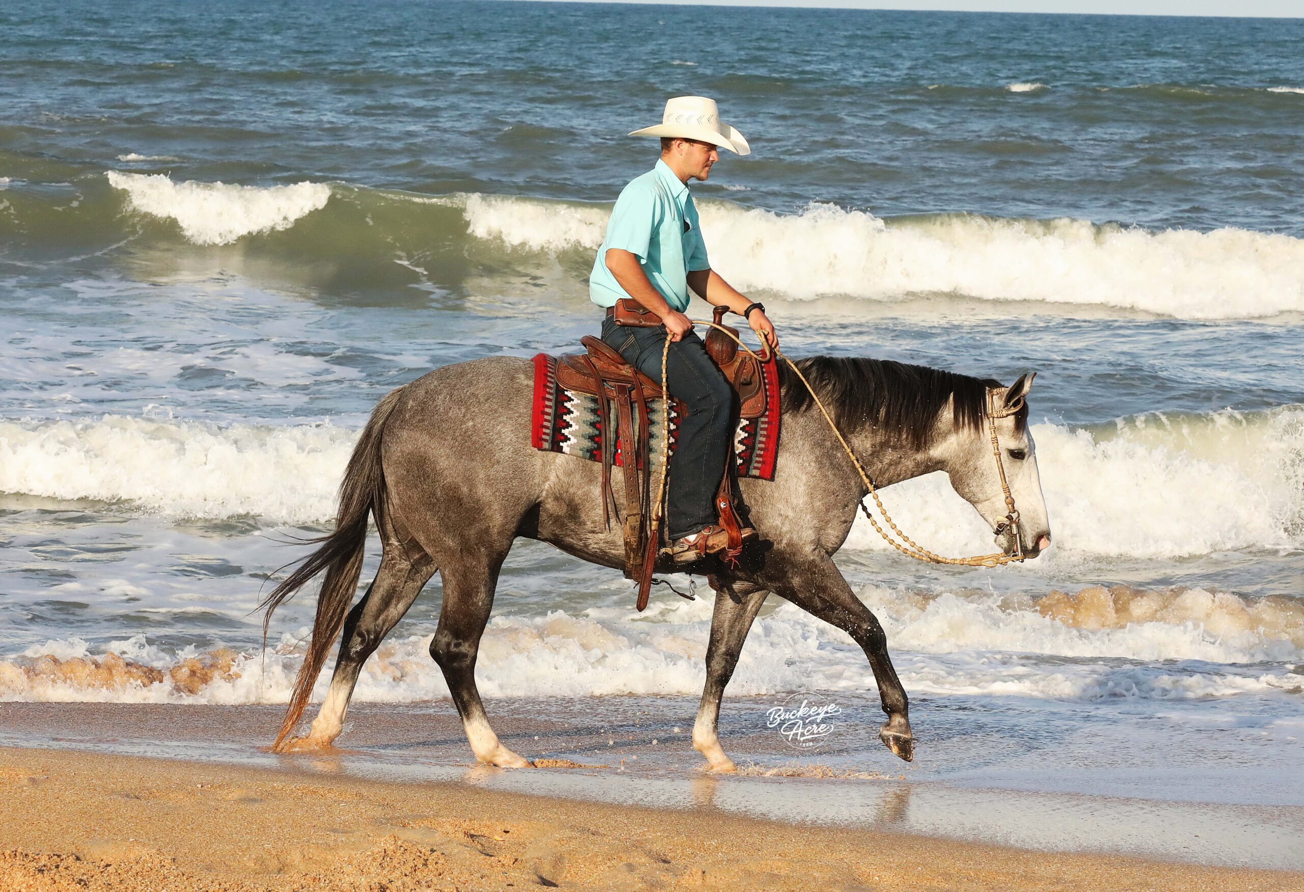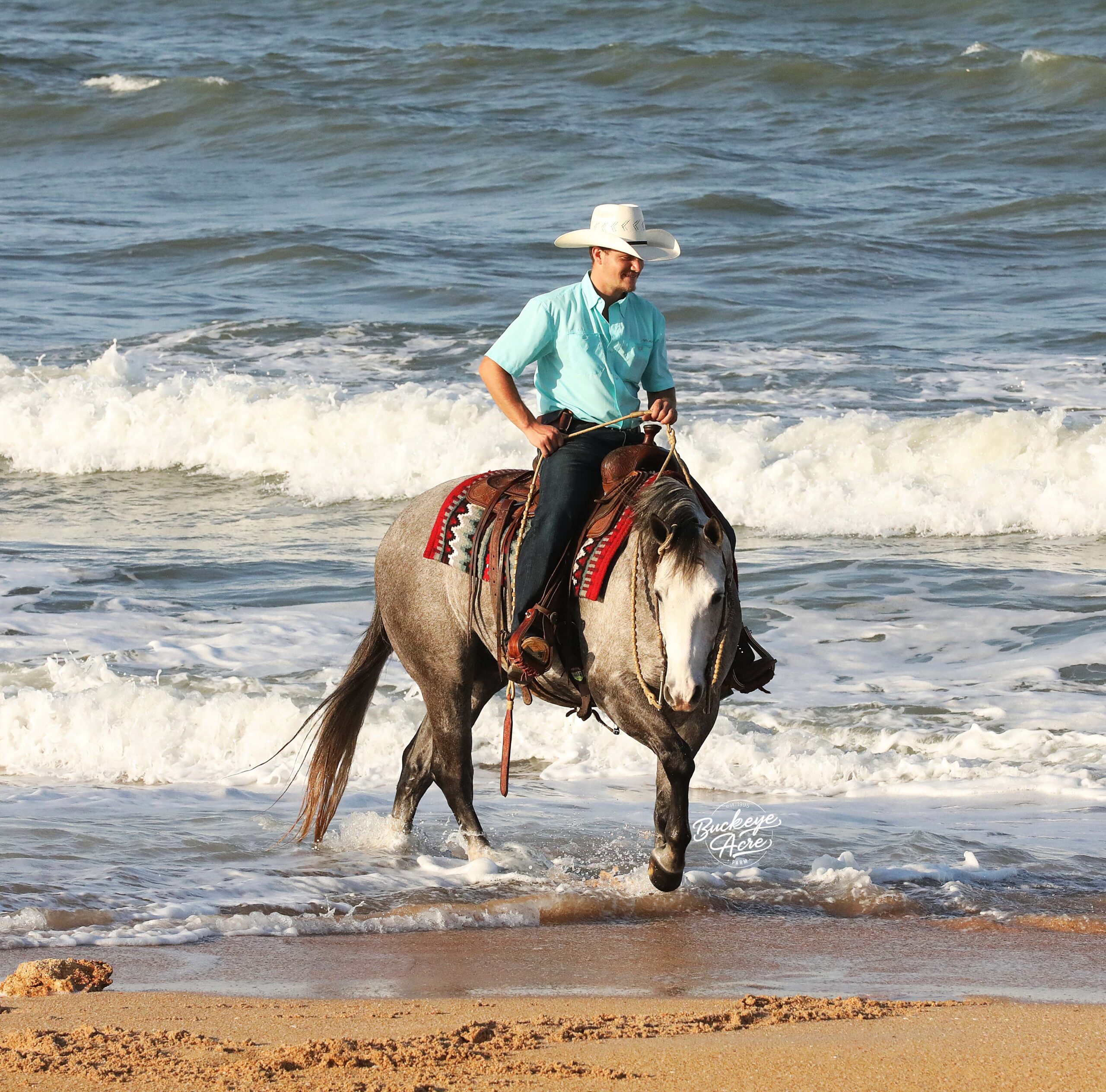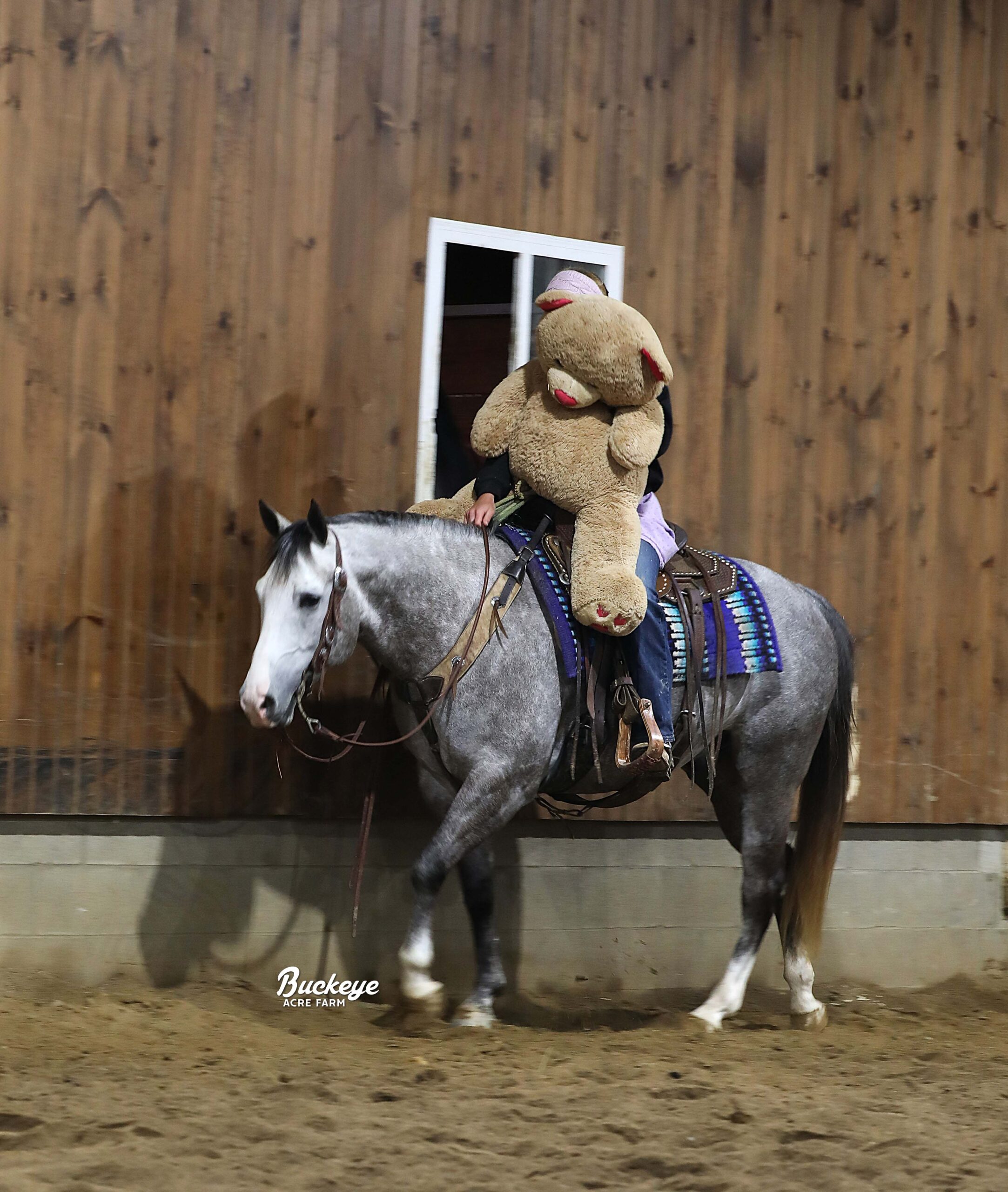 Meet Dexter, a 2020 AQHA dapple grey gelding that stands out in both looks and ability. At 14.2 hands, Dexter is built like a tank with a solid, muscular frame and four white feet that give him a striking appearance, along with a unique touch of white on his nose. His eye-catching looks will certainly turn heads wherever he goes, but it is his versatility and hardworking nature that truly make him special. Dexter has proven himself in many areas, he has been ridden extensively in the arena, on trails, and even out on the ranch gathering cattle. With his sturdy build and reliable work ethic, Dexter is more than capable of handling a day of hard work, whether that is riding out to move cattle or tackling any job around the ranch. His strong, steady gaits make him an excellent choice for trail rides, and he has been on overnight rides, where he showed great endurance and a calm demeanor in new environments. When it comes to handling different terrains and obstacles, Dexter is always up for the challenge. He has been exposed to traffic, water, taking everything in stride without hesitation. He handles crossings and uneven ground with ease, making him a reliable mount whether you’re out on a trail ride or working cattle in challenging conditions. Dexter has three smooth and comfortable gaits, making him a pleasure to ride both on trails and in the arena. He has a good one-hand neck rein, making him responsive and easy to guide in any direction. Dexter listens well to his rider, is responsive to cues, and remains calm and collected, whether he is riding out in the open or working in more challenging conditions. Due to the rough terrain where he is often ridden, he wears shoes on all four feet, ensuring that he has the traction and support needed for a long day of riding. Beyond his skills and abilities, Dexter has a gentle, sweet personality. He loves attention and is easy to handle on the ground, always meeting you at the gate and enjoying time spent with his rider. He loves people, enjoys being pampered, and thrives on human interaction. Whether you are a seasoned rider looking for a dependable workhorse or someone just starting out who needs a steady and patient mount, Dexter is up for the task. From gathering cattle in the morning to evening trail rides, Dexter is a reliable, hard-working gelding that can do it all. If you are looking for a horse with the looks, the talent, and the heart to match, Dexter is sure to be the perfect fit for any rider. For more information, please call Duane @ 330-231-2324