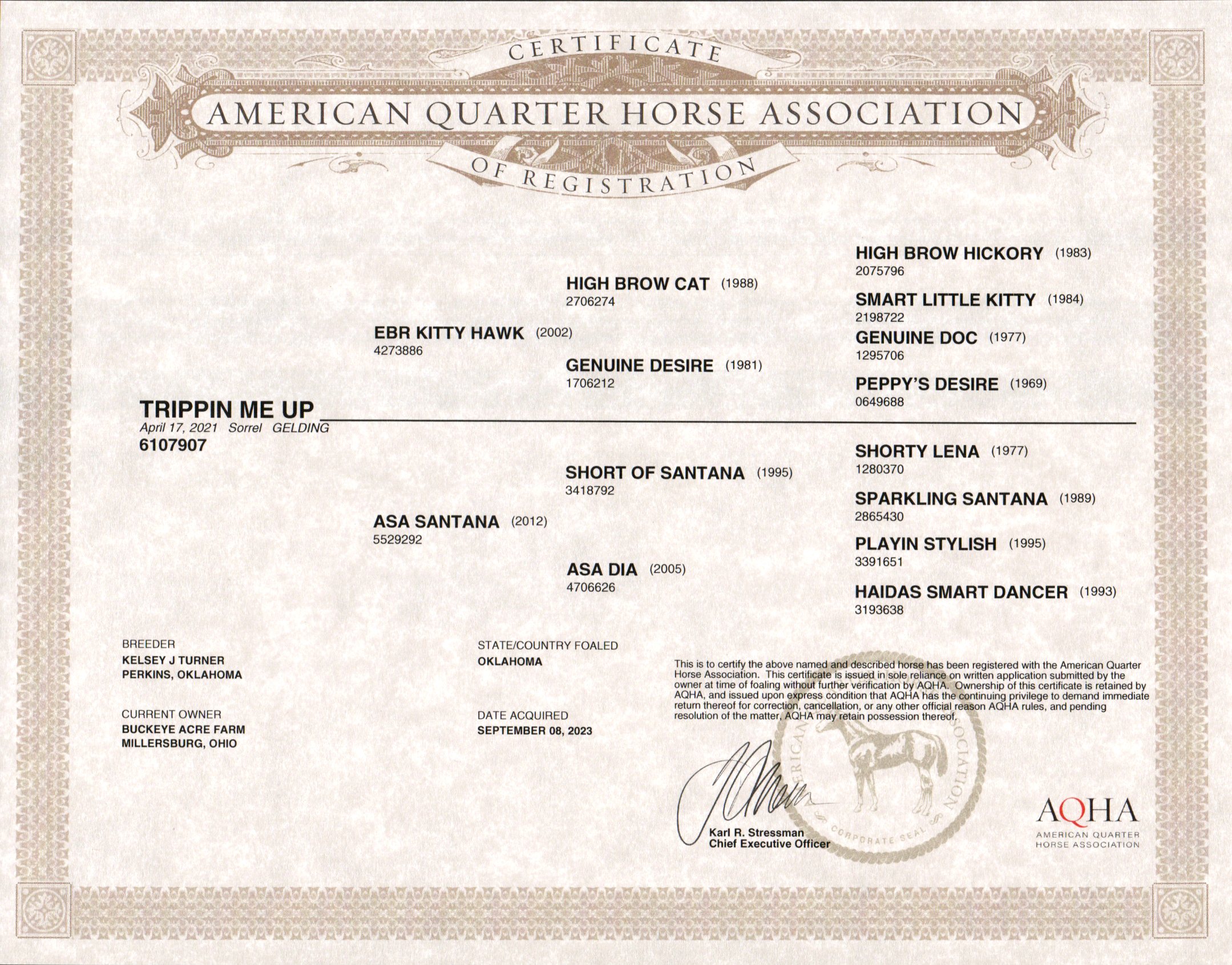 Sierra is the gelding who makes riding effortlessly, fun, and safe for everyone. This 2021 AQHA sorrel gelding standing 15 hands with good conformation, a bright eye, a star and snip on his face, and a white hind sock. With breeding going back to Hall of Fame High Brow Cat, Sierra combines pedigree, talent, and versatility like few others. There is very little this outstanding gelding has not experienced. He has been a trusted ranch-hand, worked cattle, competed in obstacle courses, and been part of countless ranch tasks. Sierra is a true anyone-can-ride horse, perfect for beginners, seniors, and advanced riders alike. He knows his leads, executes smooth lead changes, spins, and can perform sliding stops when asked. Sierra’s gaits and transitions are smooth and effortless—from walk, trot, extended trot, to canter—and he maintains consistency even if he has not ridden every day. He has traveled miles of trails, crossed streams, navigated uphill and downhill terrain, and checked fence lines with confidence. His calm and smart personality makes him a joy to ride in almost any situation. Whether in an indoor or outdoor arena, ridden western, English, bareback, or neck-reined, Sierra adapts like a pro to every rider. Children can enjoy him safely, while adults can trust him for serious ranch or show work. Walk to the barn, and you’ll never get tired of seeing that pretty head, bright eye, star, and snip looking at you, ready to be your equine friend. He has a genuine want-to-please attitude and meets you at the gate every time. Sierra is also very versatile. He has experience in ranch competitions, trail riding, arena work, obstacle courses, and even checking cows along fence lines. He is not only a talented performer but also a dependable partner for any day-to-day ranch or farm work. He does not require constant riding to stay sharp, making him perfect for busy families or riders with multiple horses. Up to date on vaccinations, deworming, and shoeing, Sierra has been Nate’s go-to horse for any job that needs doing. He is a safe, dependable, and incredibly talented gelding who will make a rider of any level feel confident and connected. If you are looking for a horse with talent, brains, heart, and personality, Sierra is the one you have been searching for. For more information or to schedule a visit, call Duane at 330-231-2324.