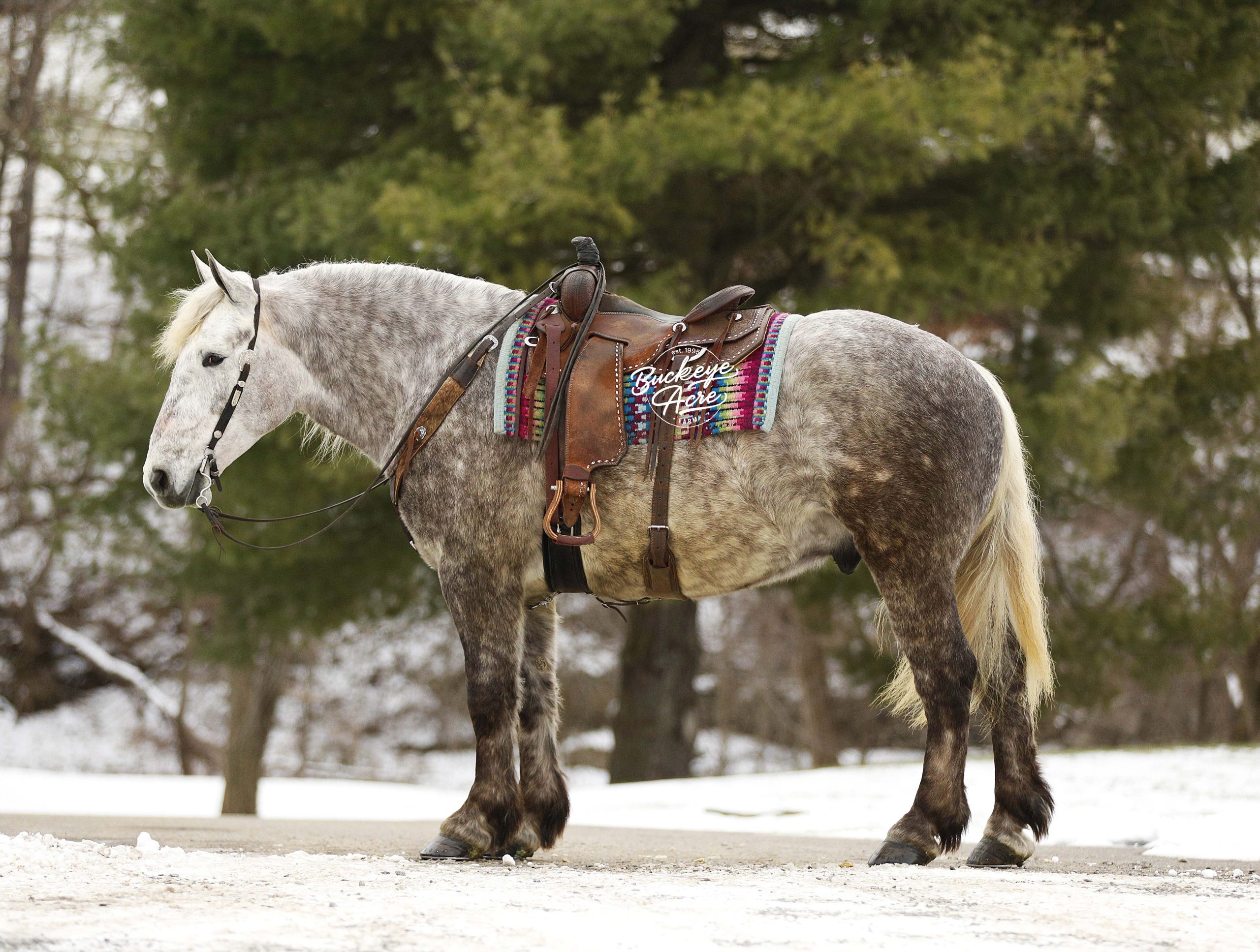 If you are looking for the kind of horse that greets you at the gate, wants to be your partner, and makes every ride feel easy, Silverado may be the one. Silverado is a beautiful 2021 model 16 hand dappled grey draft cross gelding with a true puppy dog personality and a great, willing attitude that makes him a joy to be around both on the ground and under saddle. Silverado has been on state roads through traffic, ridden in both indoor and outdoor arenas, and truly does not mind where you ride. He is happy in new places and confident in his surroundings, always focusing on his rider and wanting to please. He has smooth, comfortable gaits, knows his leads, and has been ridden western, English, bareback, and he also drives. Out on the trails, Silverado has traveled many miles through the woods and creeks, up and down hills, and over logs, taking everything in stride with a calm and steady mindset. He side passes quietly to the mounting block, is good with whips, jugs, and tarps, and has been exposed to a variety of obstacles. He even knows how to lay down and stand on a pedestal, showing his intelligence and trust in his handler. This is a safe, versatile gelding that does not need to be ridden every day to stay the same. He is kid safe, rides quietly in a group or confidently on his own and adjusts easily to different riders. In the barn, pasture, wash bay, and with the farrier, Silverado is well mannered and easy to handle. His dappled grey coat and bright, willing eyes are sure to turn heads from the barn to the pasture, and he is often the first one to meet you at the gate looking for a scratch. Whether you are searching for a dependable trail companion, a family horse, a driving horse, or a potential fox hunter, Silverado offers the kind of mind, training, and heart that makes him a rare and special find. If this sounds like the horse that you have been looking for, please feel free to reach out to Duane @ 330-231-2324 for more info or to Schedule a day to stop by our farm and see him in person.