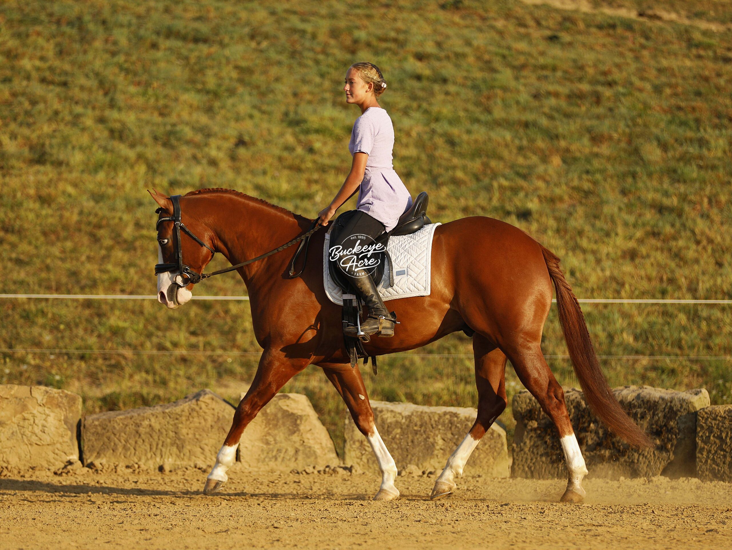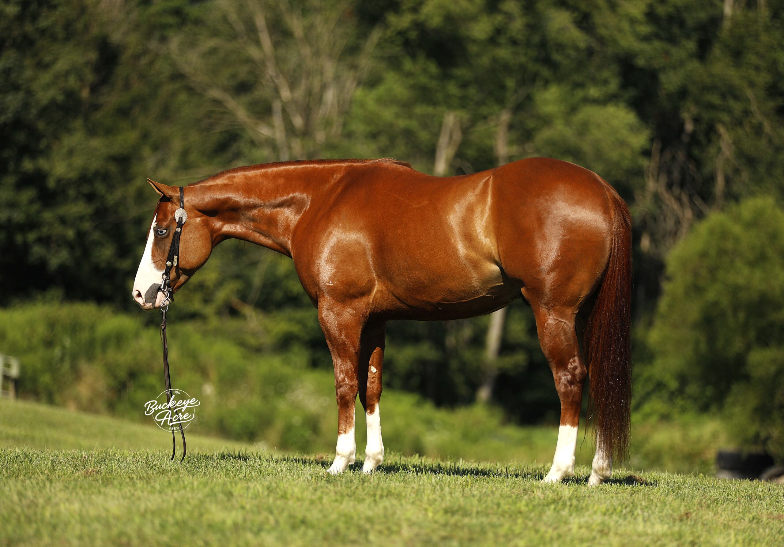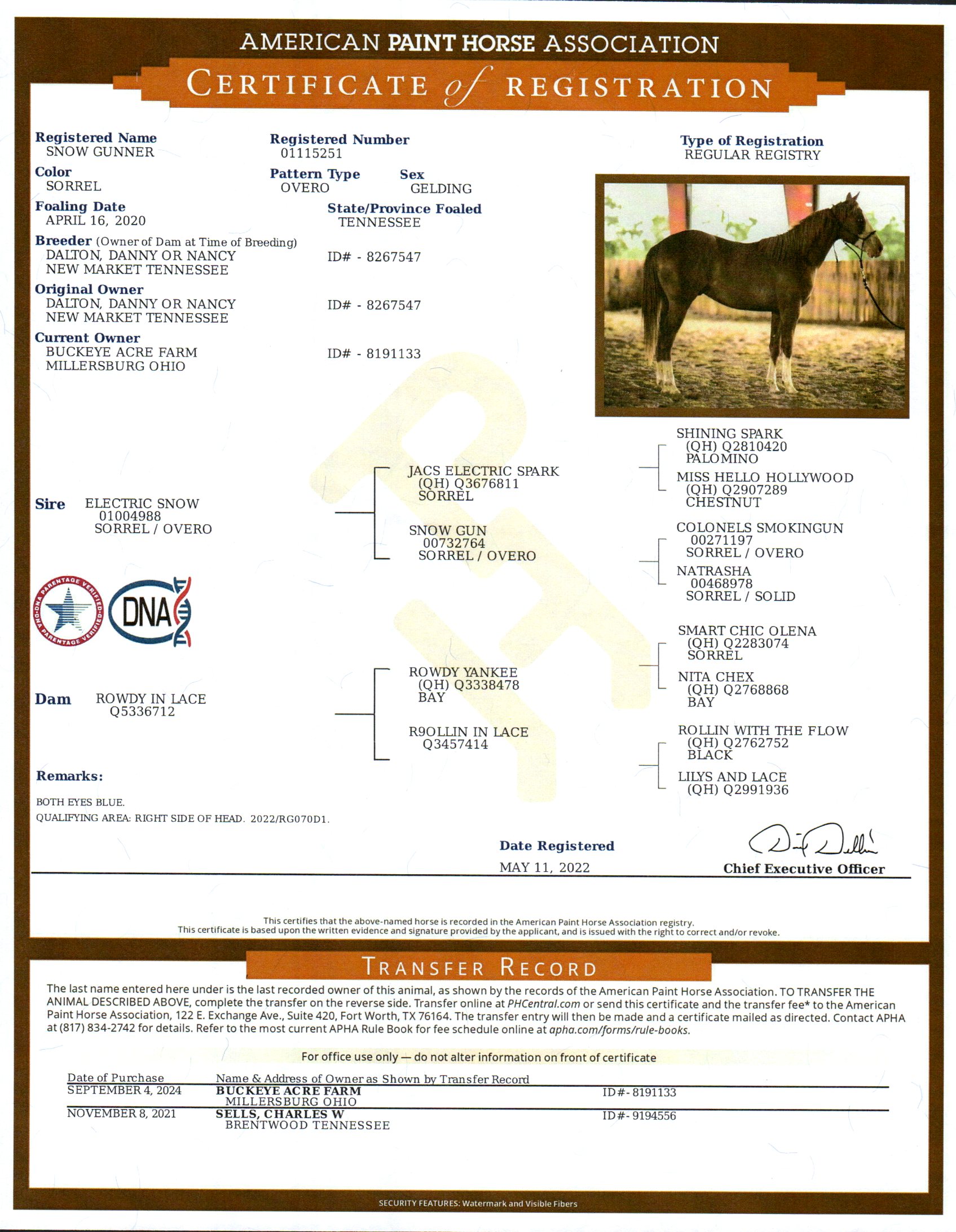 Are you looking for that all-in-one versatile family horse? We think Sunrise could be the one. This 2020 sorrel gelding stands at a near-perfect 15 hands, dressed in four white socks and a bald face that makes him absolutely unforgettable. His sharp conformation and athletic build are paired with a kind, gentle eye and a presence that always turns heads. From his looks to his breeding to his personality, Sunrise truly has it all. Sunrise is every bit as enjoyable to be around as he is to ride. He is a gentleman in every sense of the word, whether in the barn or out in the pasture, always meeting you at the gate with a bright expression and eager for scratches and attention. He is steady, patient, and safe, making him a horse that can be enjoyed by riders of all levels. From kids just starting out, to seniors wanting a dependable trail partner, to advanced riders looking for a horse with ability and buttons, Sunrise adjusts to his rider and gives his all. This gelding has been ridden safely on state roads in traffic, has spent countless hours on the trails, and takes on any terrain you point him toward. He will cross water, step over logs, and handle steep hills going up or down with confidence. His smooth, easy gaits—from walk to extended trot to lope—are comfortable enough to enjoy all day long. He knows his leads, carries a soft one-hand neck rein, performs lead changes, and has been used to check cows and fence lines. He is well desensitized to tarps, jugs, whips, and even gunshots, making him steady and dependable in nearly any situation. Best of all, Sunrise does not need to be kept in a steady program to remain your trusted partner. Adding to all this is his outstanding pedigree. Sunrise is an own son of Electric Snow, whose offspring have earned over $480,000, and his lineage goes back to the Hall of Fame sire Shining Spark. On the dam’s side, he traces to the legendary Smart Chic Olena, another Hall of Fame horse. With this foundation, Sunrise has the ability and talent to take into the show pen, yet he is quiet and dependable enough to be enjoyed by kids and grandkids on a weekend trail ride. That kind of versatility is hard to find. Our own children have ridden him all over the farm, and Sunrise enjoyed every minute with them. He is good in the wash bay, stands quietly for the farrier, and is up to date on dental care, vaccinations, and deworming. From his looks, his pedigree, his training, and his willing-to-please personality, Sunrise is a horse that can fit a wide variety of needs. You could show him one day, hit the trails the next, and trust him with the kids the day after that. If you have been searching for a horse that truly checks every box, Sunrise could fit the bill. For more information or to schedule a day to meet him in person, contact Duane at 330-231-2324.