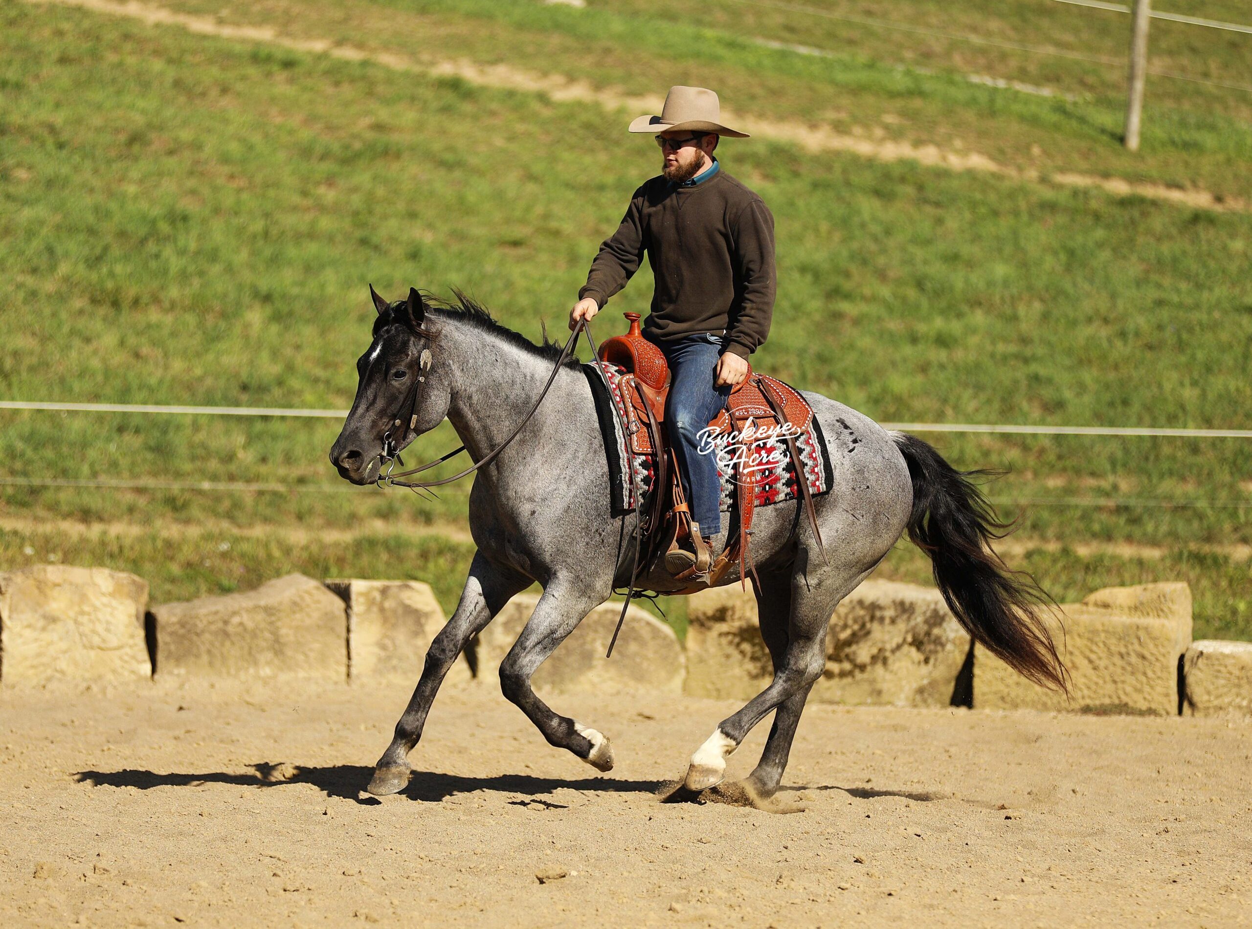 Meet Tokyo, a beautiful, good-minded 2021 model blue roan Grade Quarter Horse gelding standing a strong 15 hands tall with all the right looks and an even better attitude. His blue roan dappled color, one white hind sock, and small white star set perfectly on his forehead make him a true standout everywhere he goes. Pair with a bright, soft eye and a natural want-to-please attitude, and you have a gelding that is as dependable as he is attractive. Tokyo is the kind of horse you can ride out of the barn any day of the week and know exactly what you are getting. He drops his head right where it should be, settles into his work, and stays quiet, soft, and steady from start to finish. He does not require daily riding to stay safe and honest—give him a couple of days off or give him a week, he comes back the same every time. He has been exposed to all kinds of environments and takes everything in stride. Tokyo has seen new places, covered lots of trail miles, and is confident in both indoor and outdoor arenas. He has been down state roads and through traffic without batting an eye. Jugs, tarps, whips, water crossings, logs, uphill, downhill, you can point him anywhere and he goes with confidence and charm. Versatility is another thing he offers in spades. Tokyo rides western, English, and bareback, will side pass, ride bride less, and stay soft in the bridle. He is the kind of horse you can trust for kids, seniors, beginners, or advanced riders. He is solid and forgiving, yet responsive enough for someone who wants to do more. He rides out alone or with a group and keeps a calm, collected way of going that makes every ride feel steady and dependable. He has a good forward walk, a willing trot, and a consistent way of carrying himself that makes him enjoyable for riders of all levels. In the barn or wash bay he is calm, mannerly, and easy to handle. He is also good with loading and unloading from the trailer, making hauling a breeze. Tokyo is up to date on deworming, vaccinations, and shoeing and is ready to fit seamlessly into someone’s program, family, or riding routine. If this sounds like the horse that you have been looking for, please feel free to reach out to Duane @ 330-231-2324 for more info or to Schedule a day to stop by our farm.